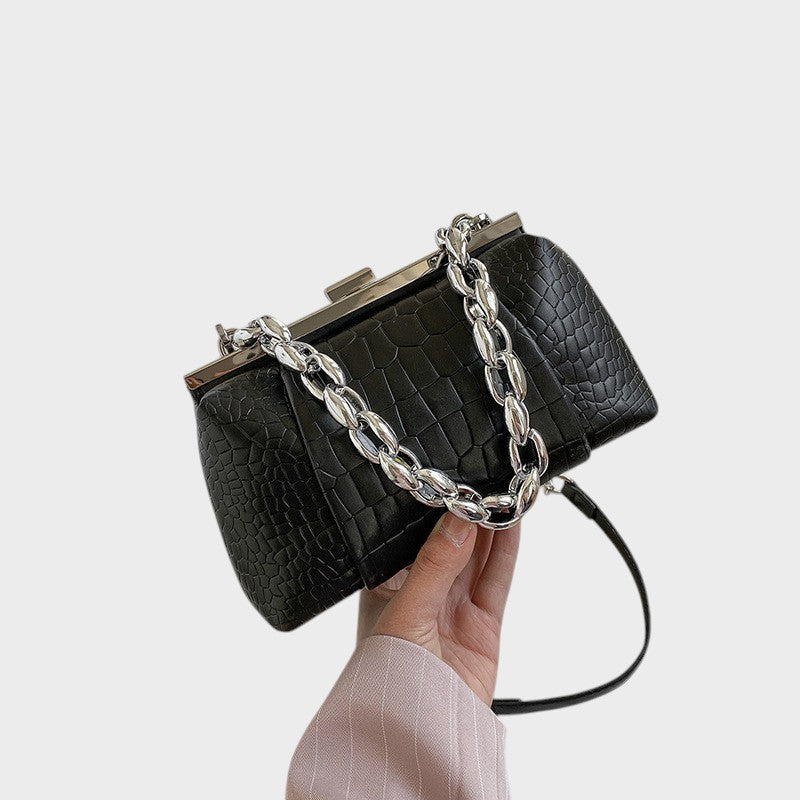 Z teksturą krokodyla i solidną strukturą, ta torebka łączy wyrafinowanie i indywidualność w jednym akcesorium. Jej klasyczny metalowy zamek i mocny łańcuszkowy uchwyt tworzą nowoczesny i imponujący kontrast. Idealna dla tych, którzy szukają kompaktowego, praktycznego elementu z silną obecnością, zarówno na dzień, jak i na noc.