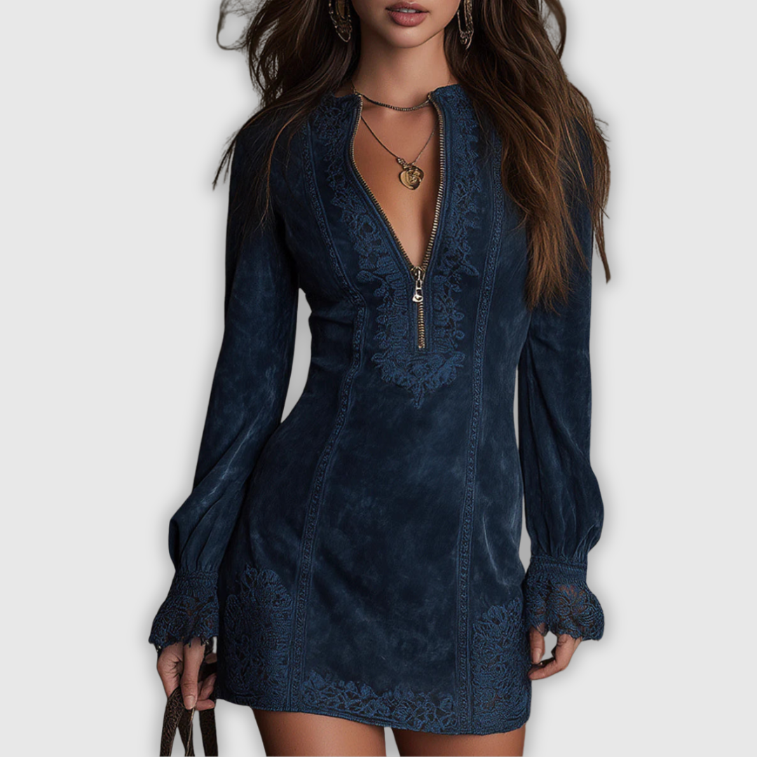 Rachela – Niebieska zamszowa mini sukienka z koronką